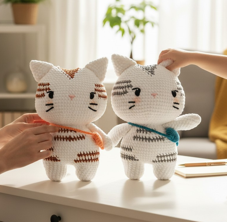 Ces chats sont réalisés en fil chenille 100% polyester certifié OEKO-TEX et les yeux sont brodés avec du fil coton.
