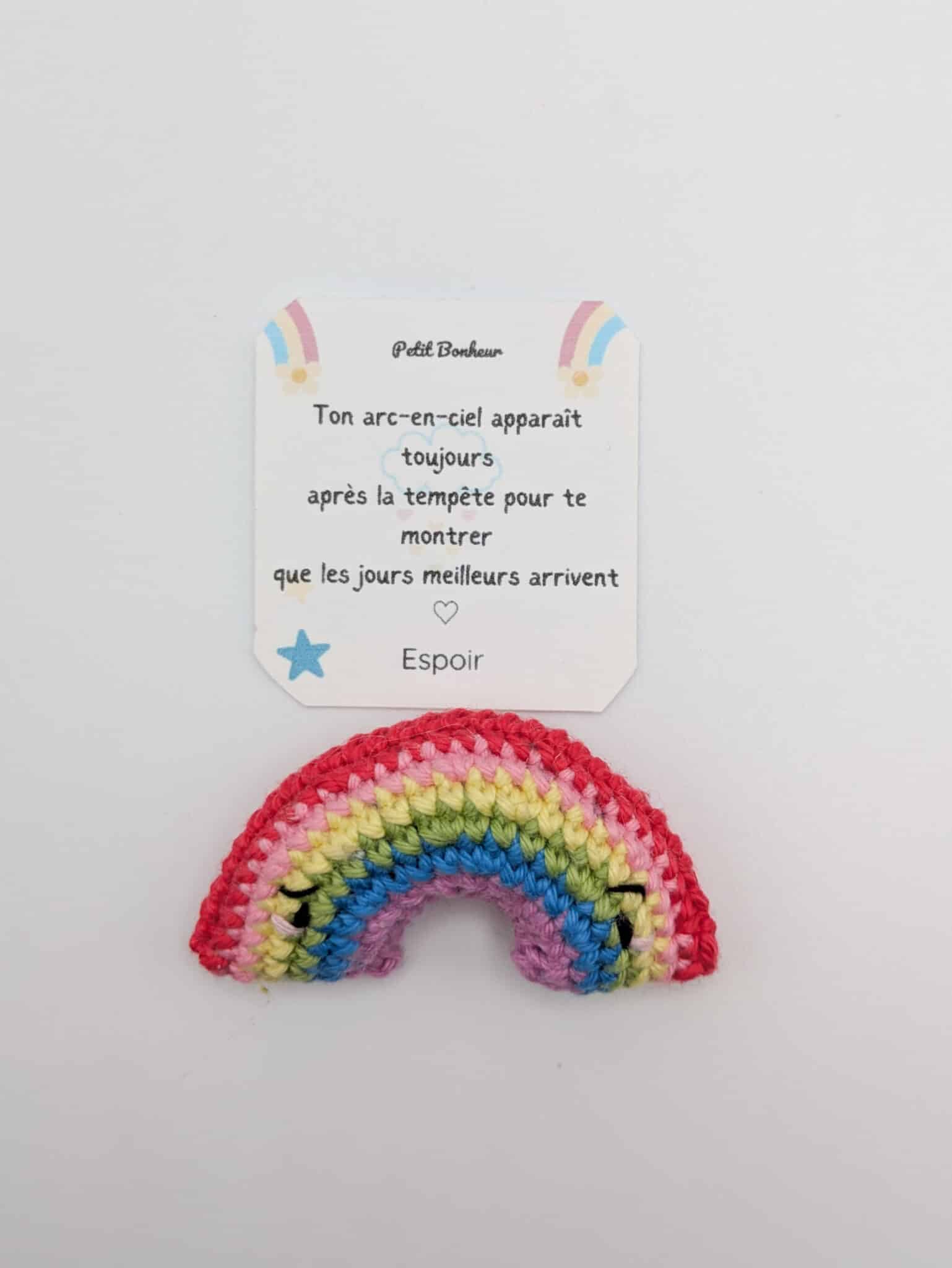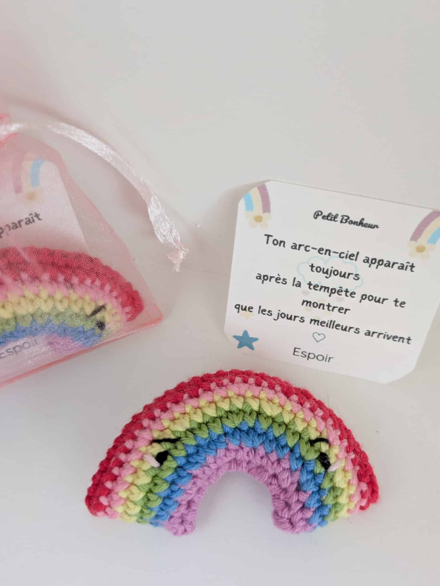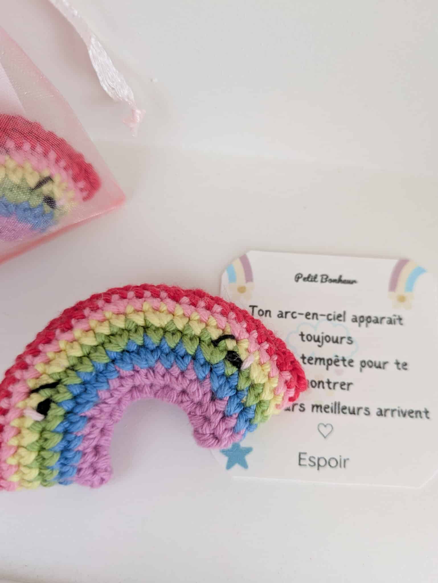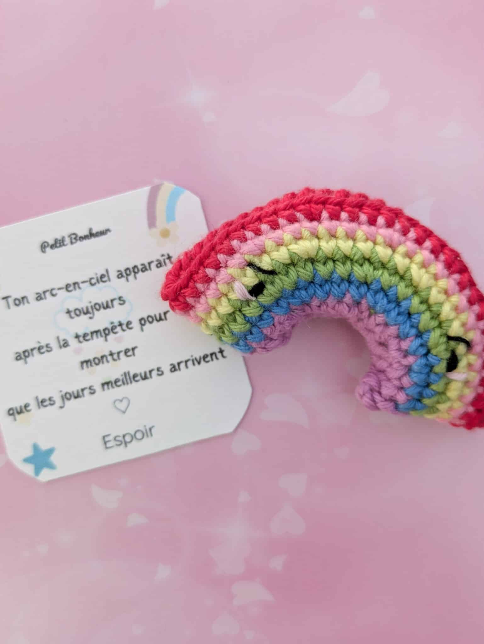 Avec ses couleurs vives et son petit visage, cet arc-en-ciel amigurumi au crochet apporte une touche d’espoir et de gaieté partout où tu vas.