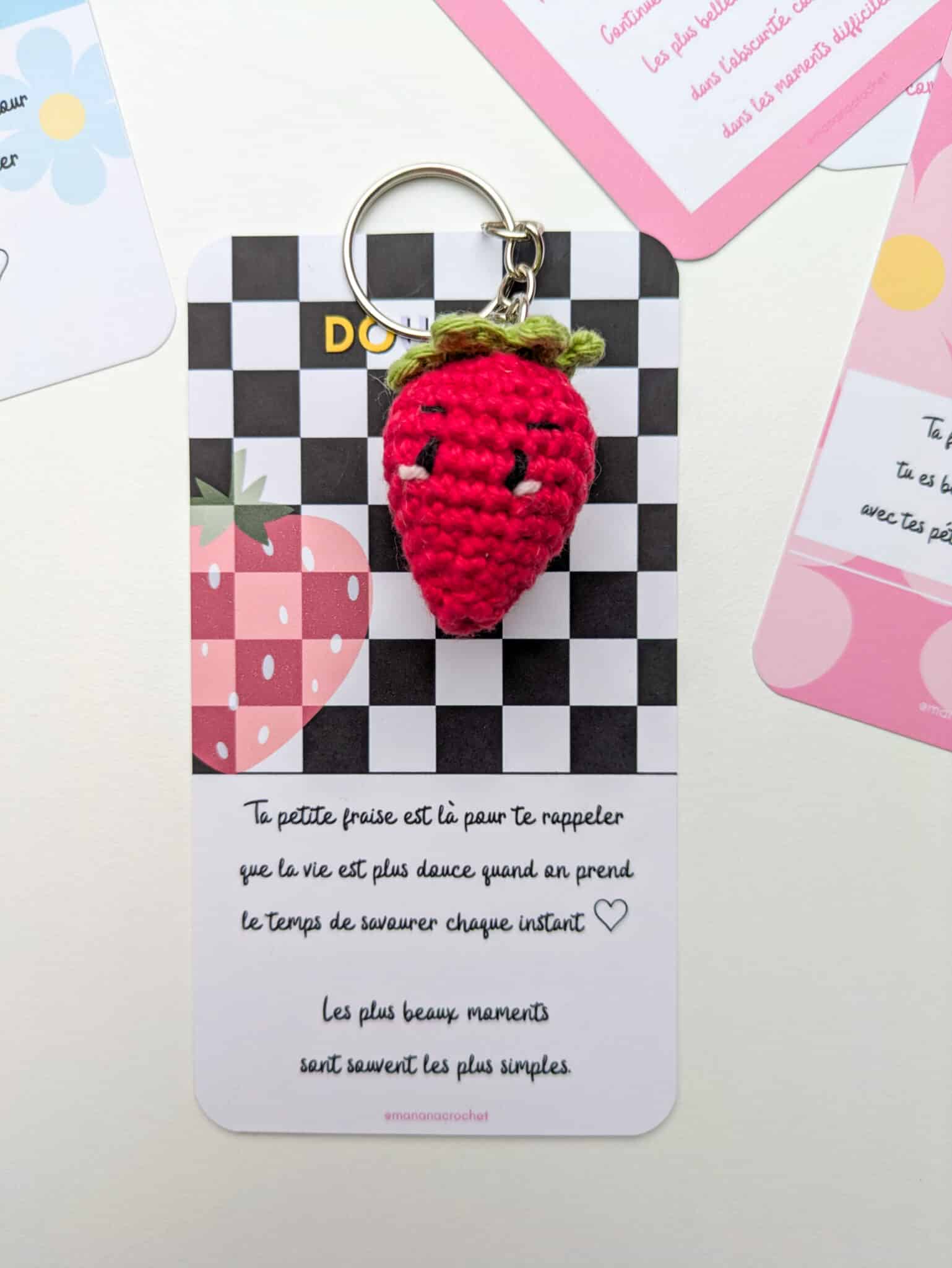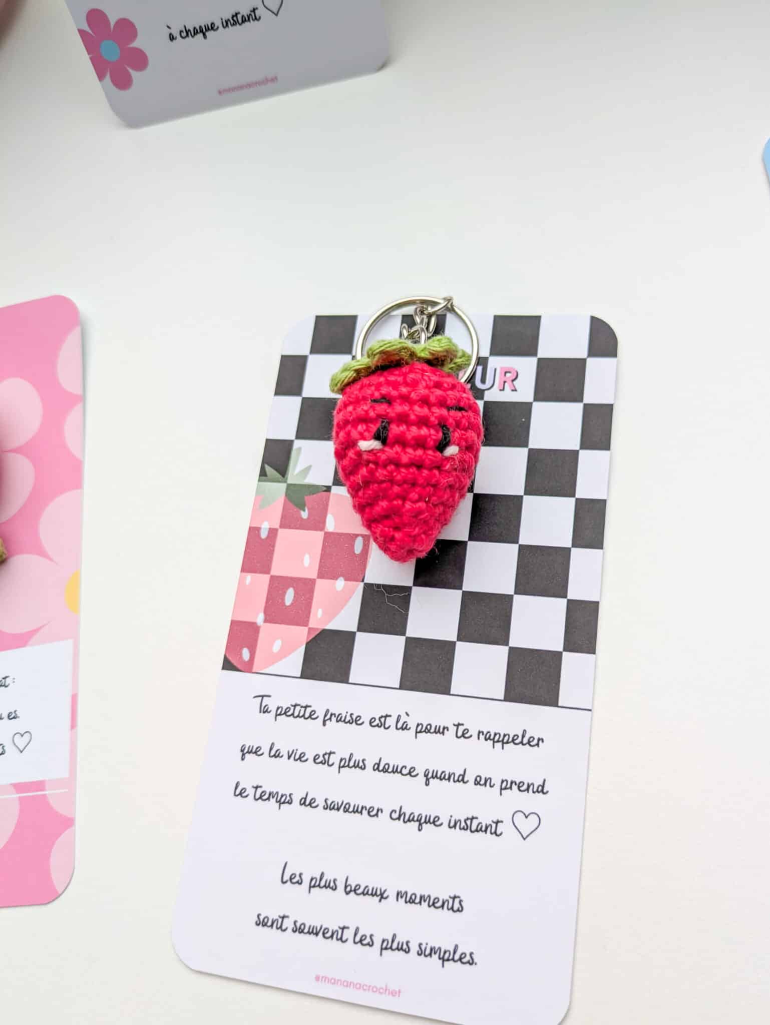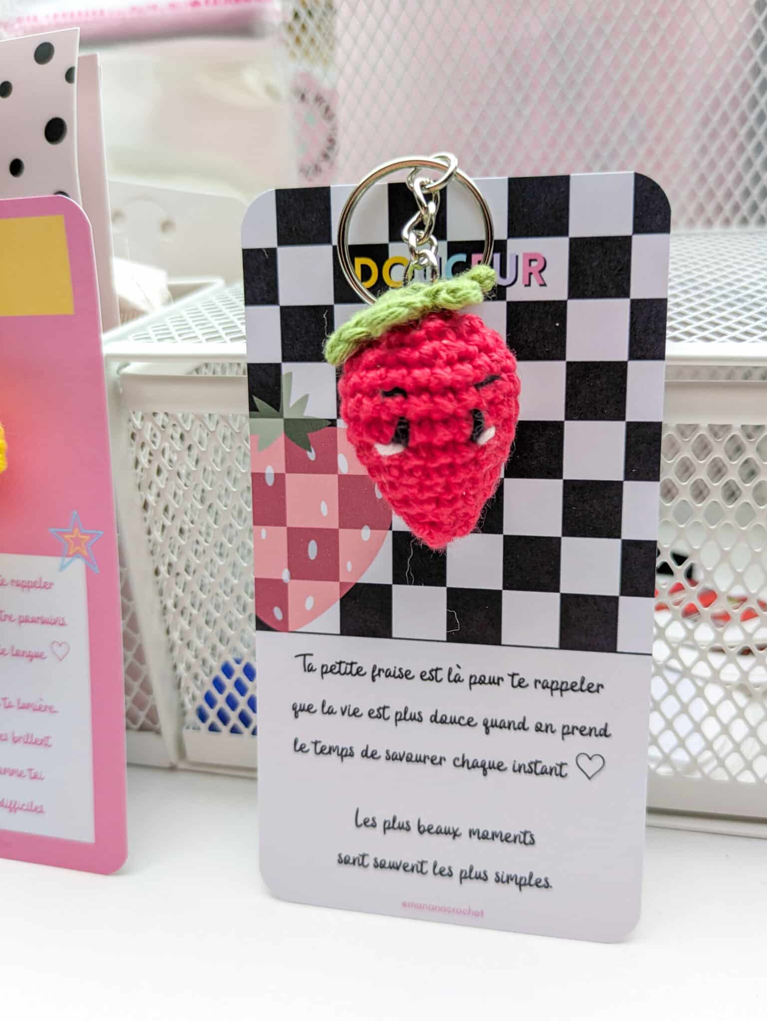Avec sa couleur rouge vif et son visage kawaii, cette petite fraise amigurumi au crochet t’invite à profiter des petits moments sucrés de la vie.