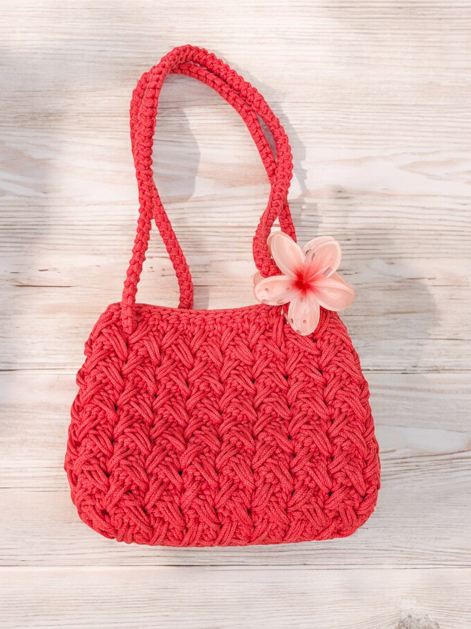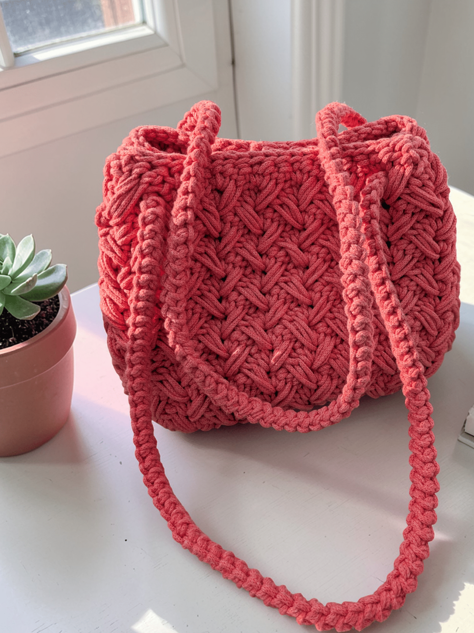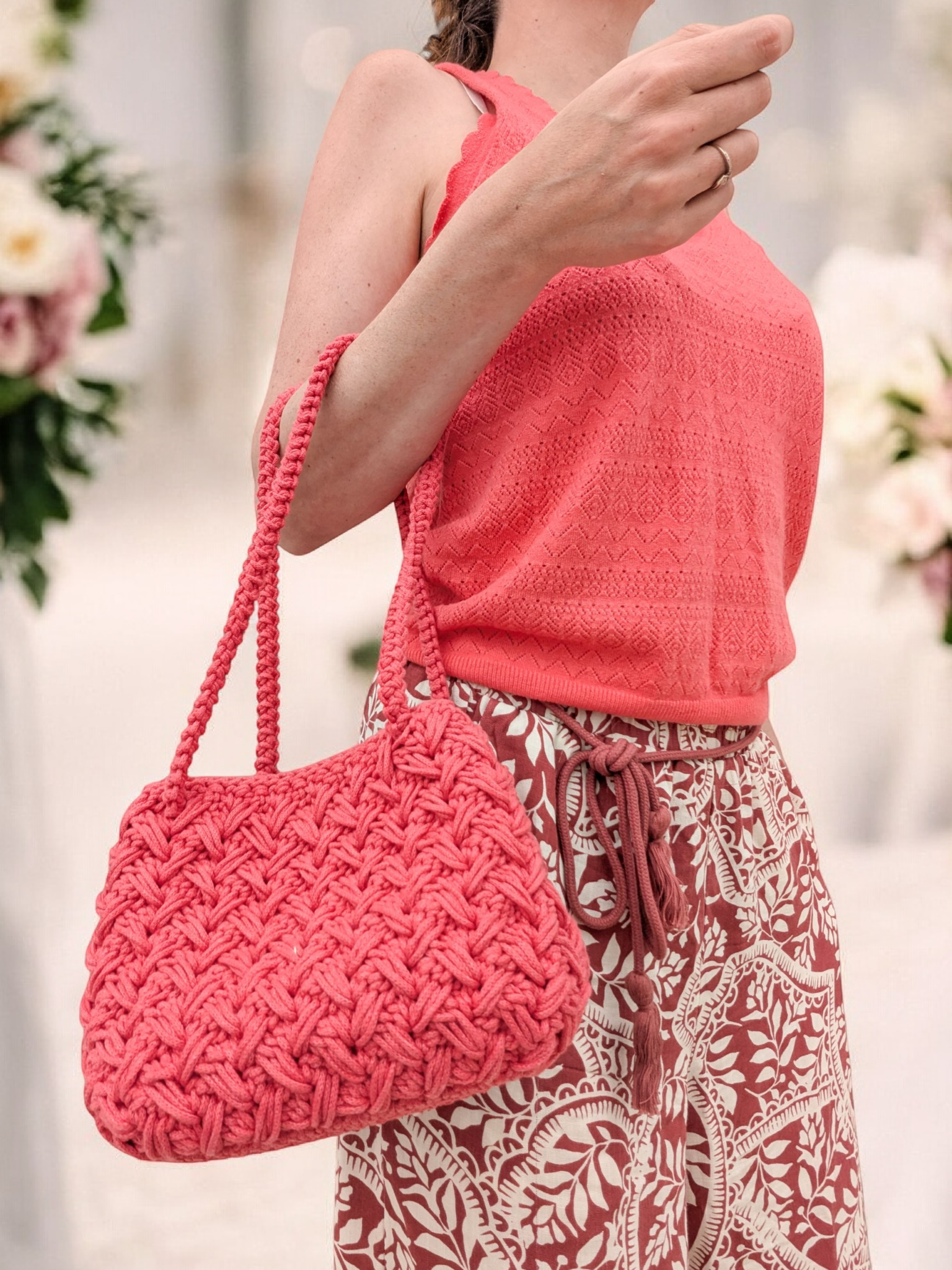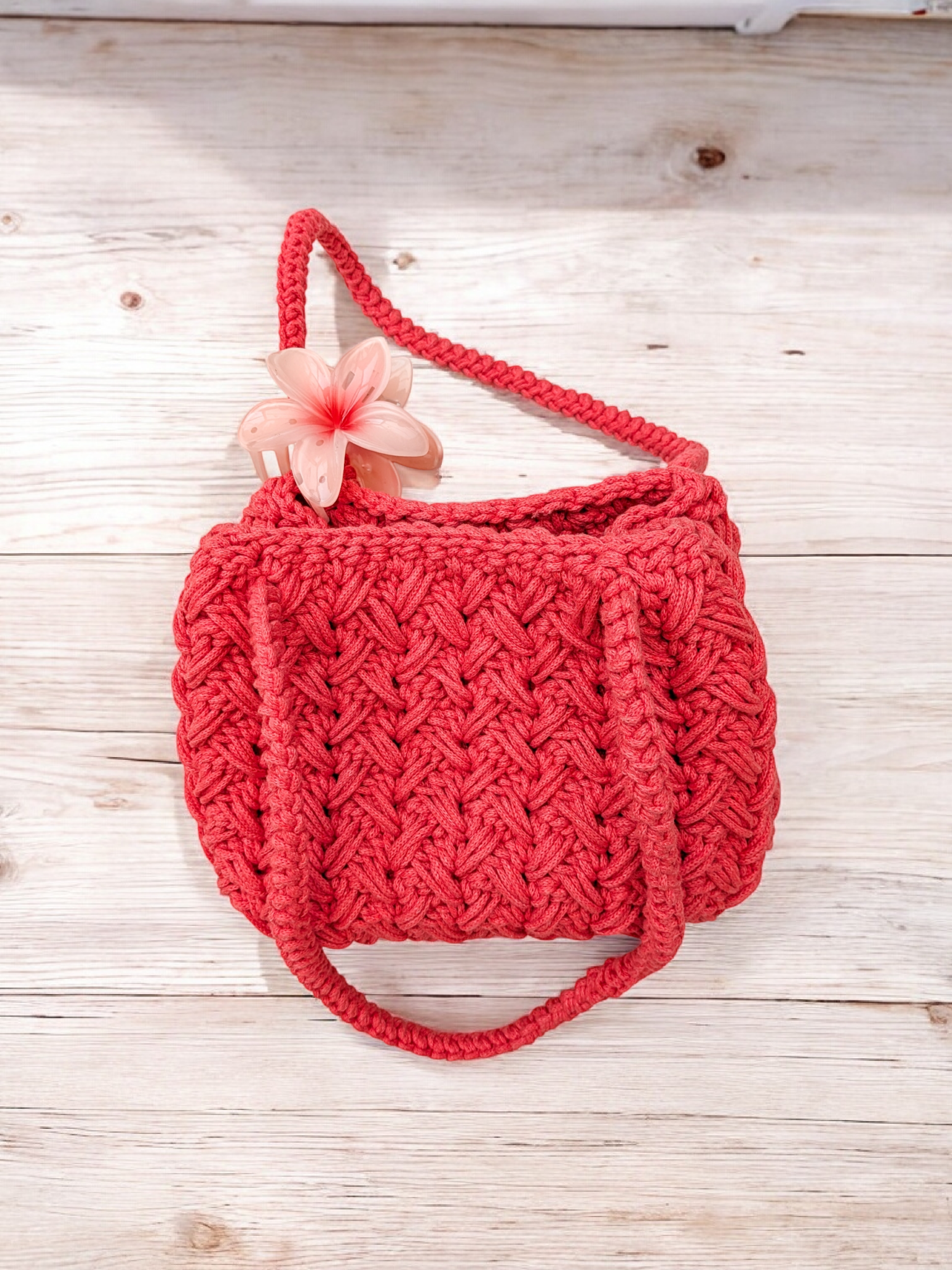 Ce sac à main couleur corail en crochet fait main apporte instantanément une touche douce, moderne et résolument féminine à votre tenue. Réalisé en coton recyclé, il se distingue par sa tenue robuste, son aspect légèrement texturé et son charme artisanal incomparable.